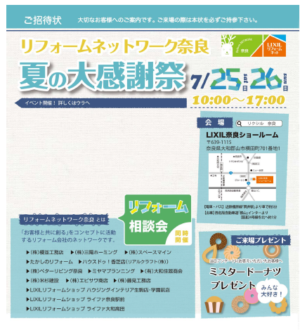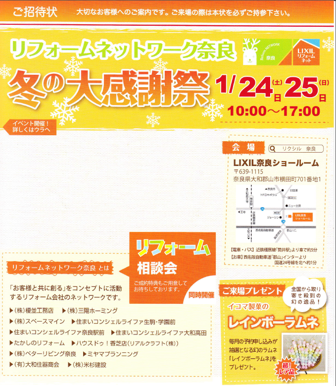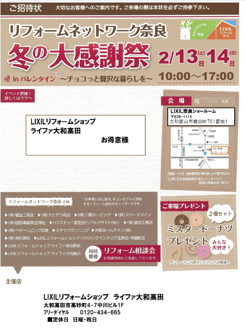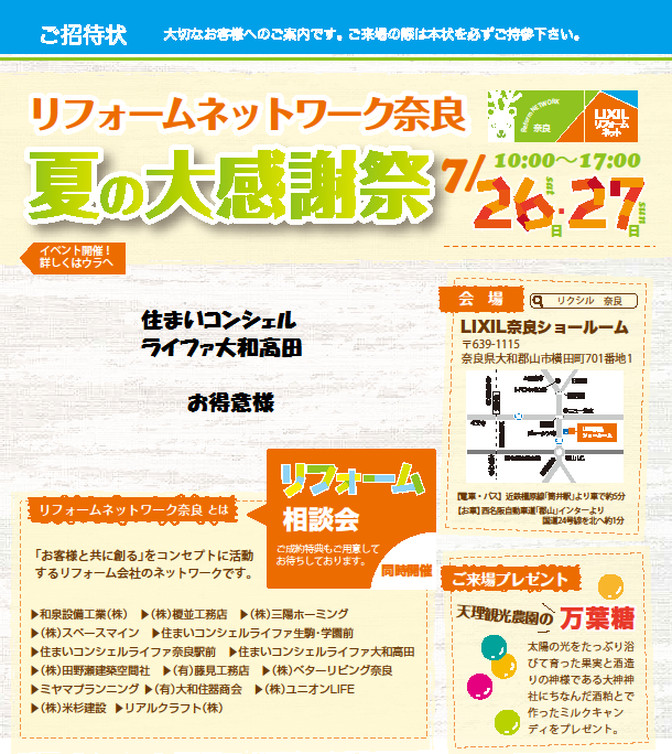 当日、受付で「ライファ大和高田のホームページを見て」と言っていただけ たらご招待状をお渡しいたします。